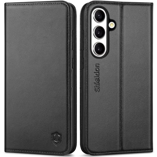 SHIELDON Case for Galaxy S25+ Plus 5G, Genuine Leather Wallet Case [Card Holder][Kickstand][RFID Blocking][Shockproof TPU Shell] Magnetic Flip Cover Compatible with Galaxy S25 Plus 6.7" 2025 - Black
