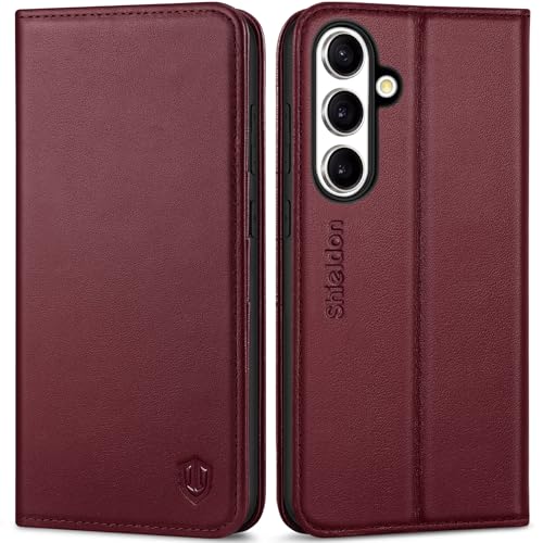 SHIELDON Case for Galaxy S25+ Plus 5G, Genuine Leather Wallet Case [RFID Blocking][Card Holder][Viewing Stand] Magnetic Shockproof Protective Cover Compatible with Galaxy S25 Plus 6.7" - Wine Red