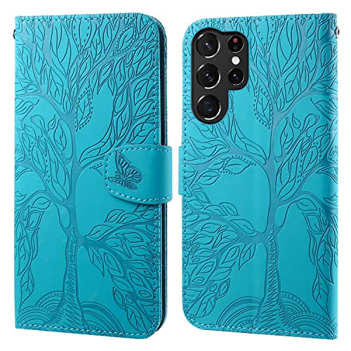 Aisenth Flip Case for Samsung Galaxy S25 Ultra, The Tree of Life Embossed PU Leather Wallet Phone Folio Case Magnetic Protective Cover with Kickstand, Card Slots + 1 Wrist Strap (Blue Green)