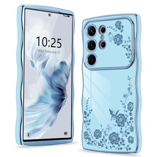 Wirvyuer for Samsung Galaxy S25 Ultra Case, Plating Curly Wave Frame Cute Girly Floral Flower for Women Girls Cover, Raised Full Camera Protection Phone Case for Samsung Galaxy S25 Ultra, Blue