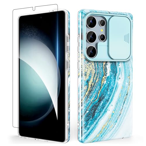 SHEDEER for Samsung S25 Ultra Case with Slide Camera Cover + Screen Protector, Samsung Galaxy S25 Ultra Case Slim Fit Lightweight, Glossy Fade-Resistant Pattern Phone Cases S25 Ultra, Blue
