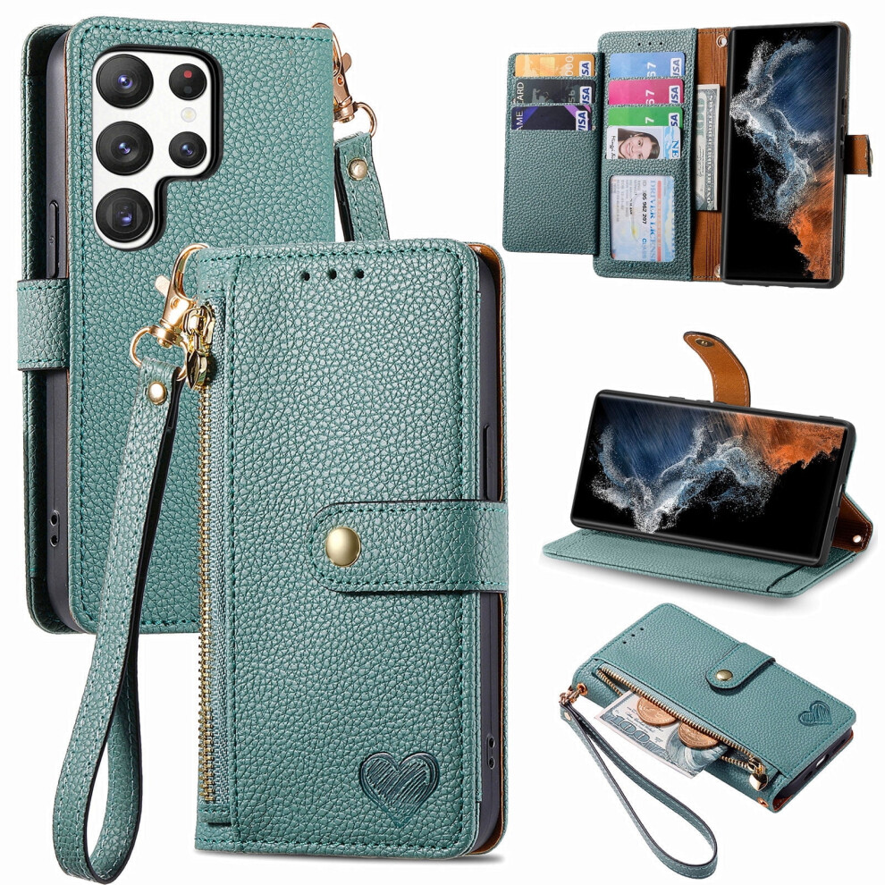 for compatible with Samsung S25 Ultra S25Plus S25 S24 Wallet case, RFID shielded heart-shaped leather bag zipper wallet wristband Phone Case