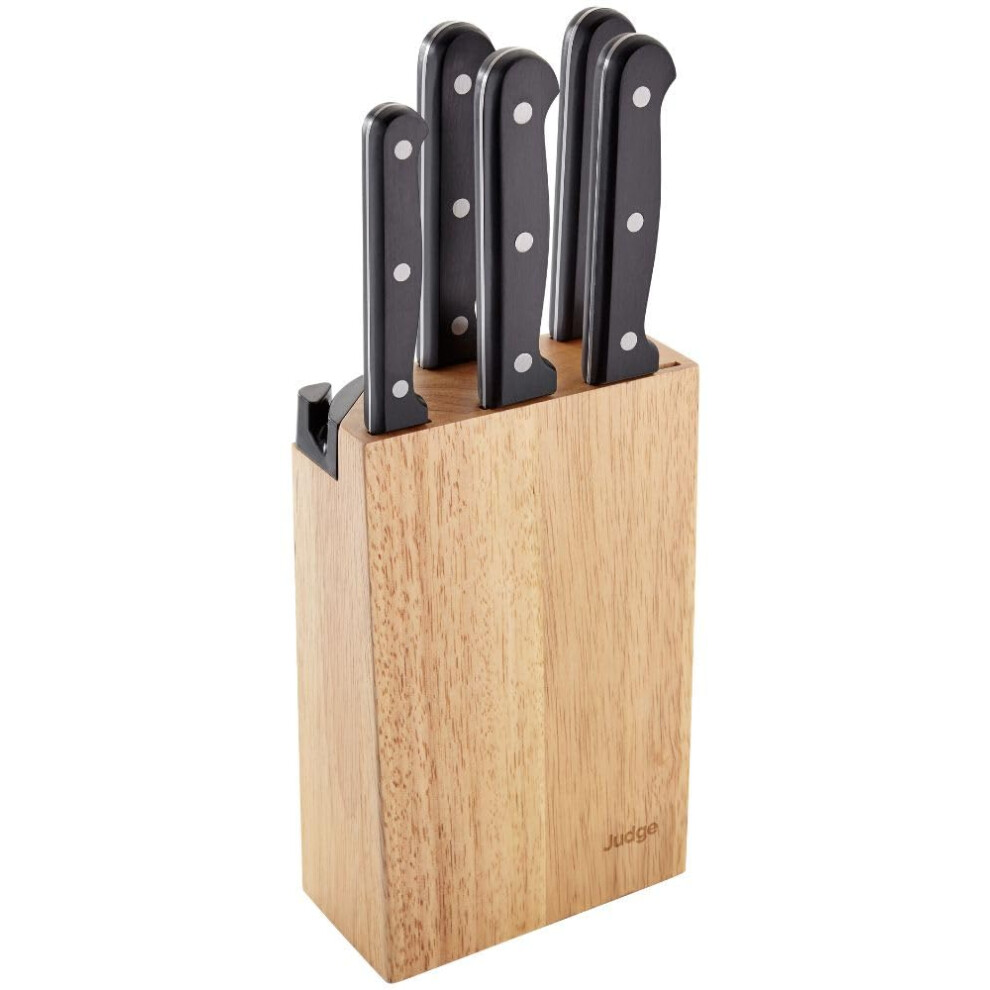 Judge Pro 5-Piece Knife Block Set - with Paring, Utility, Carving, Bread + Cooks Knife - High-Grade Carbon Stainless Steel Blade, Dishwasher Safe, Hard-Wearing Wood Handle, Easy to Sharpen