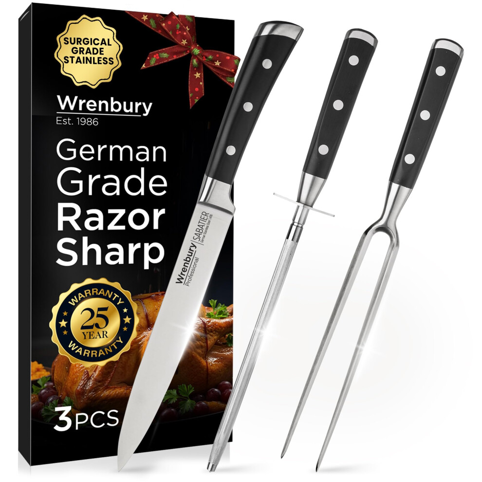 Wrenbury Sabatier Carving Knife Set with Carving Fork and Sharpening Steel - German Grade 3 Piece Professional Carving Set Razor Sharp Blade - Full