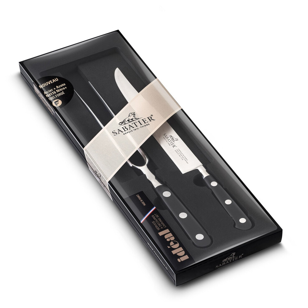 SABATIER - Meat Carving Set with 1 Slicing Knife and 1 Carving Fork, 100% forged, stainless steel blades, black POM handles