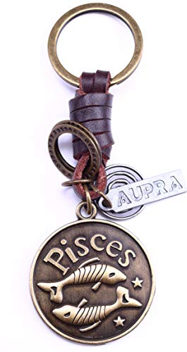 AuPra Pisces Zodiac Leather Keyring Best Friend Gift Idea Women & Men Safe House Keychain Fishes Horoscope Simbol Charm Girl & Boy Friendship Small Present Car Key Ring Pendant