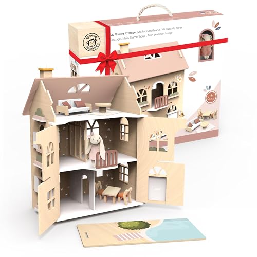 SPEEDY MONKEY Flowers Cottage Starter Set: Elegant Wooden Dolls House | Beautiful Multicolour Play House | FSC Certified Includes Furniture, Safe Tiny House Wooden Toys for Kids