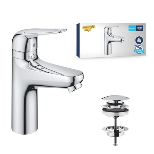 GROHE Swift QuickFix – Basin Mixer with Push-Open Waste Set & Child-Safety Lock (M-Size 185mm, 28mm Ceramic Cartridge, Water Saving, Tails 3/8 Inch, Easy to Fit with GROHE QuickTool), Chrome, 24327001
