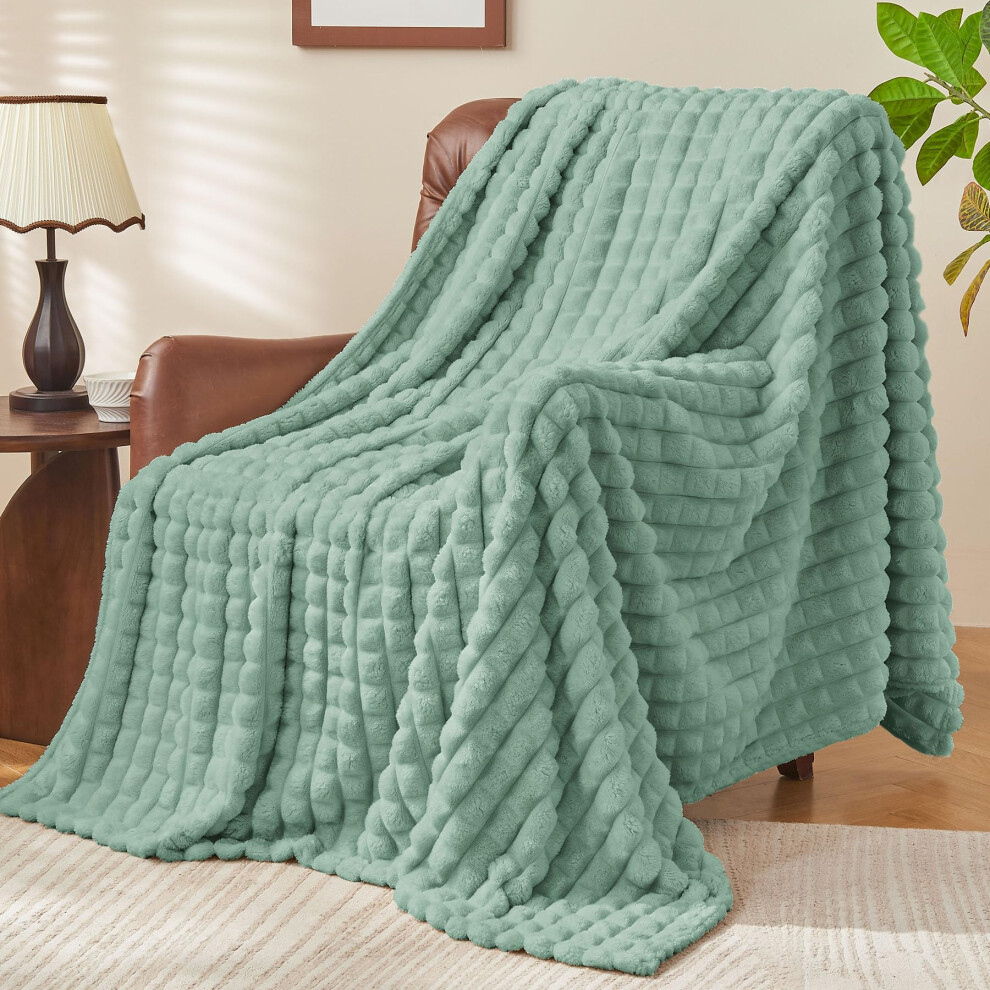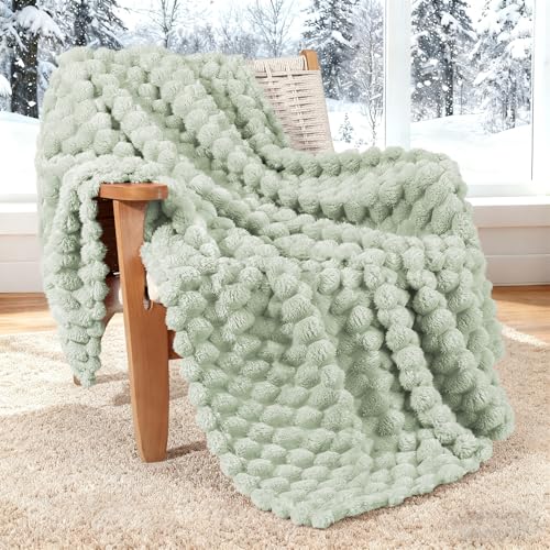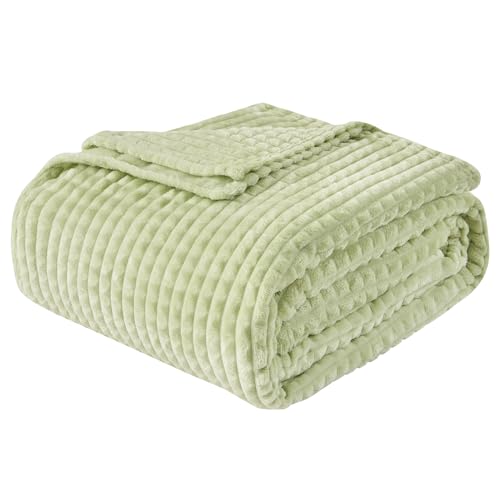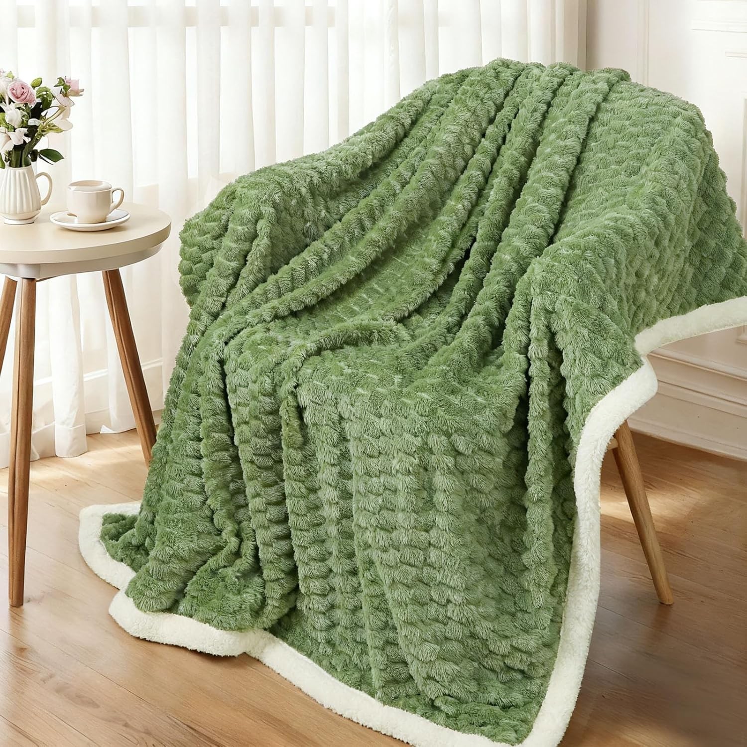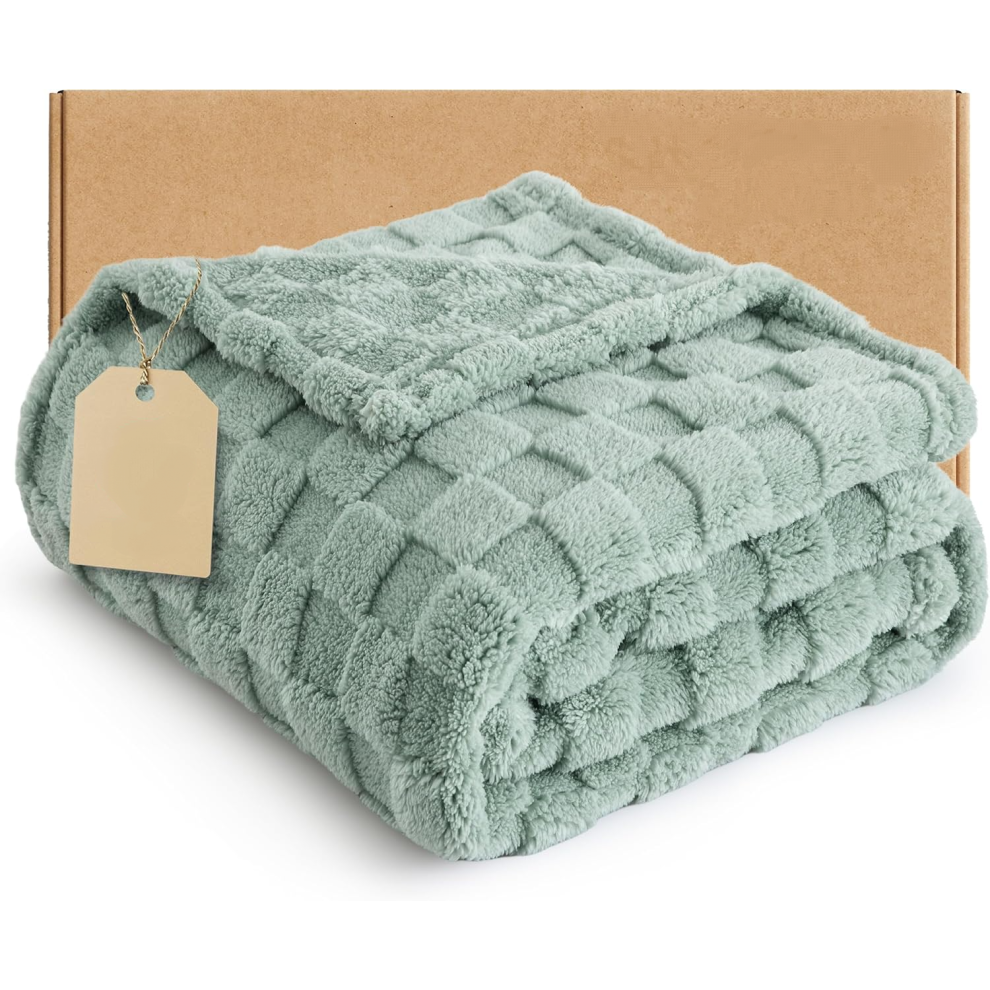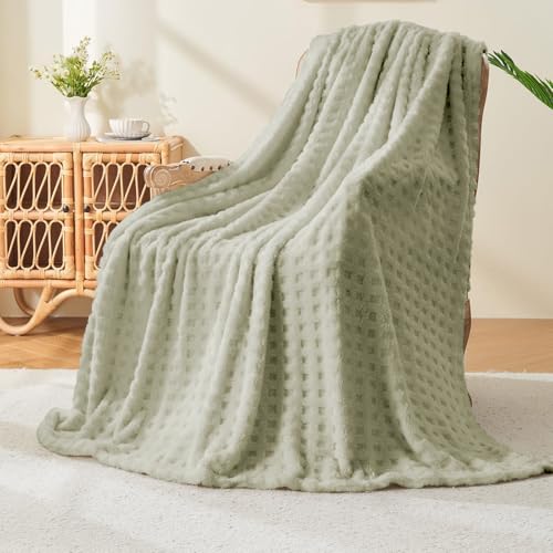 Wajade Fleece Throw Blanket, Fluffy Faux Fur Blanket for Bed Sofa Couch, Soft Warm Thick Blanket,waffle Sage Green-127X178