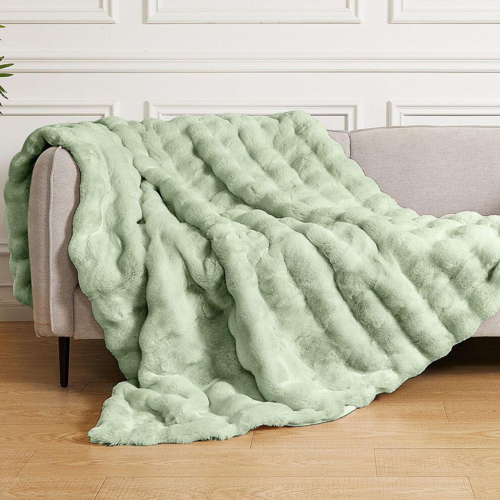 OHS Blanket Throw Faux Fur, Winter Warm Thick Ribbed Blanket for Bed Sofas Fleece Throws for Home Decorative Comfy Super Soft Couch Cover - Sage Green, 125 x 150cm