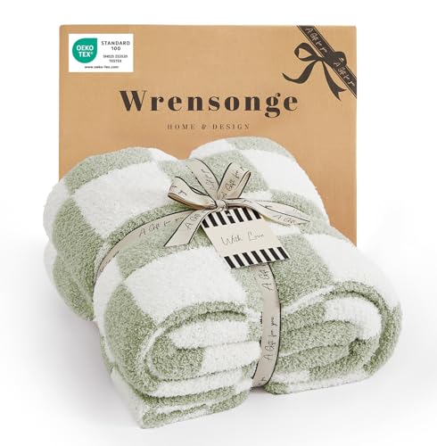WRENSONGE Checkered Throw Blanket, Sage Green Microfiber Soft Cozy Fluffy Warm Hand Made Throw Blankets for Couch, Sofa, Chair, Bed, Camping, Picnic, Travel Lightweight Bed Blanket - 50"*70"