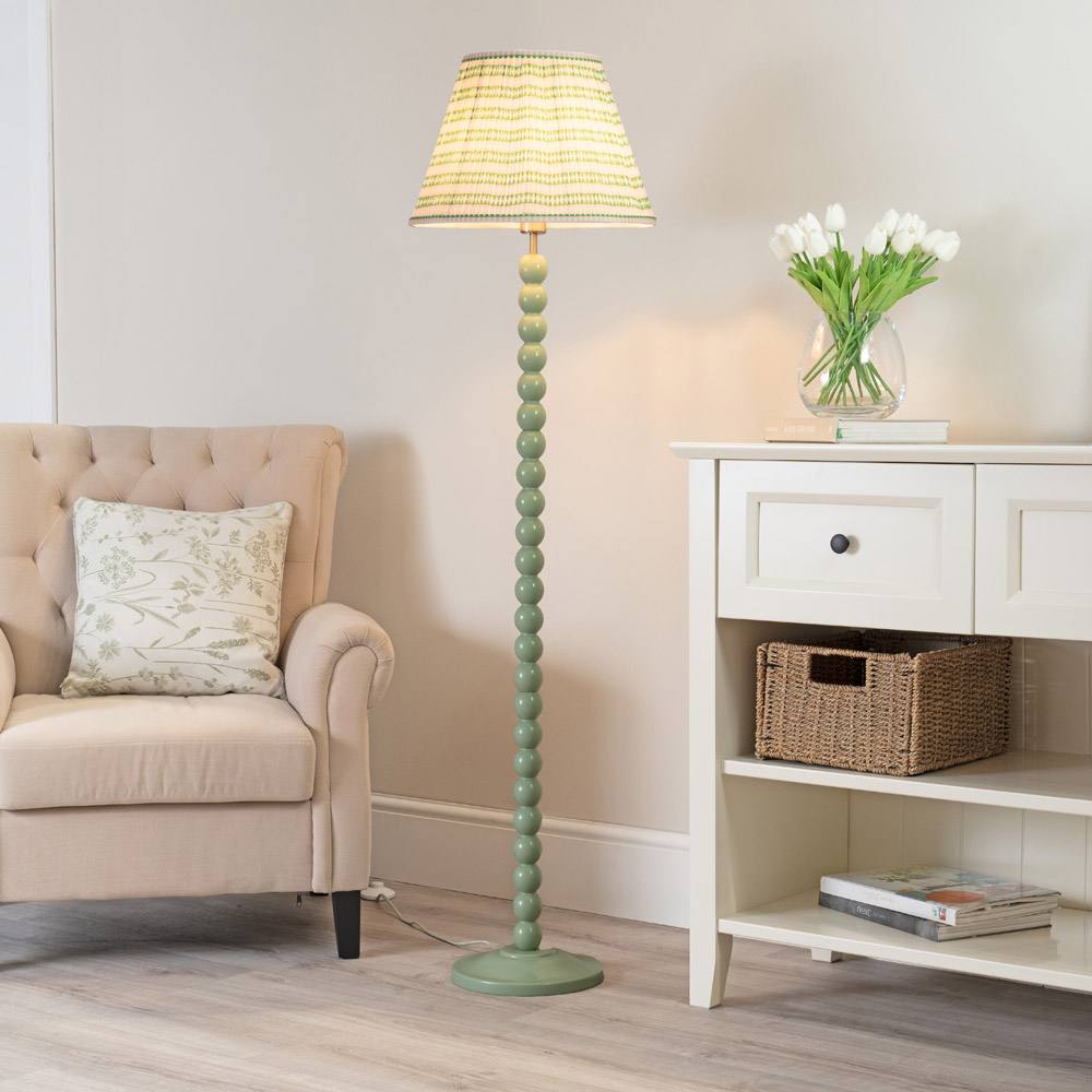 ValueLights Bobbins Sage Green Floor Lamp with Floral Embroidered Drum Lamp Shade in Pale Green
