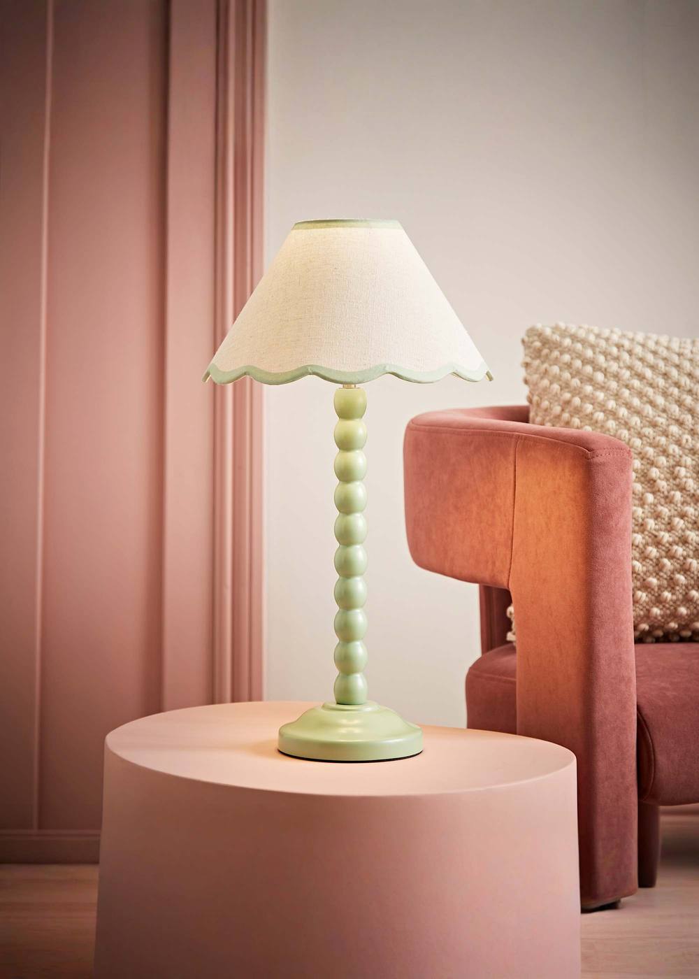 ValueLights Bobbins Sage Green Table Lamp with Tapered Natural Linen Scallop Shade in Pale Pink