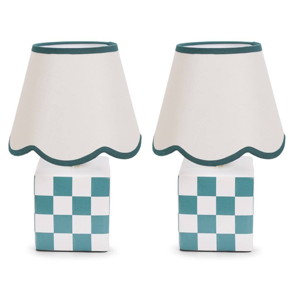 ValueLights Evie Pair Ceramic Cube Table Lamp with Sage Green Trim Linen Scallop Lamp Shade
