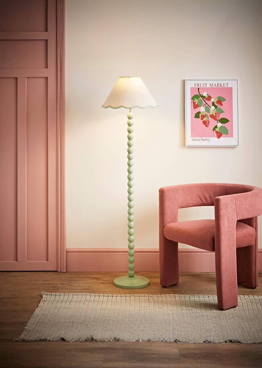ValueLights Bobbins Sage Green Floor Lamp with Tapered Natural Linen Scallop Shade in Pale Pink
