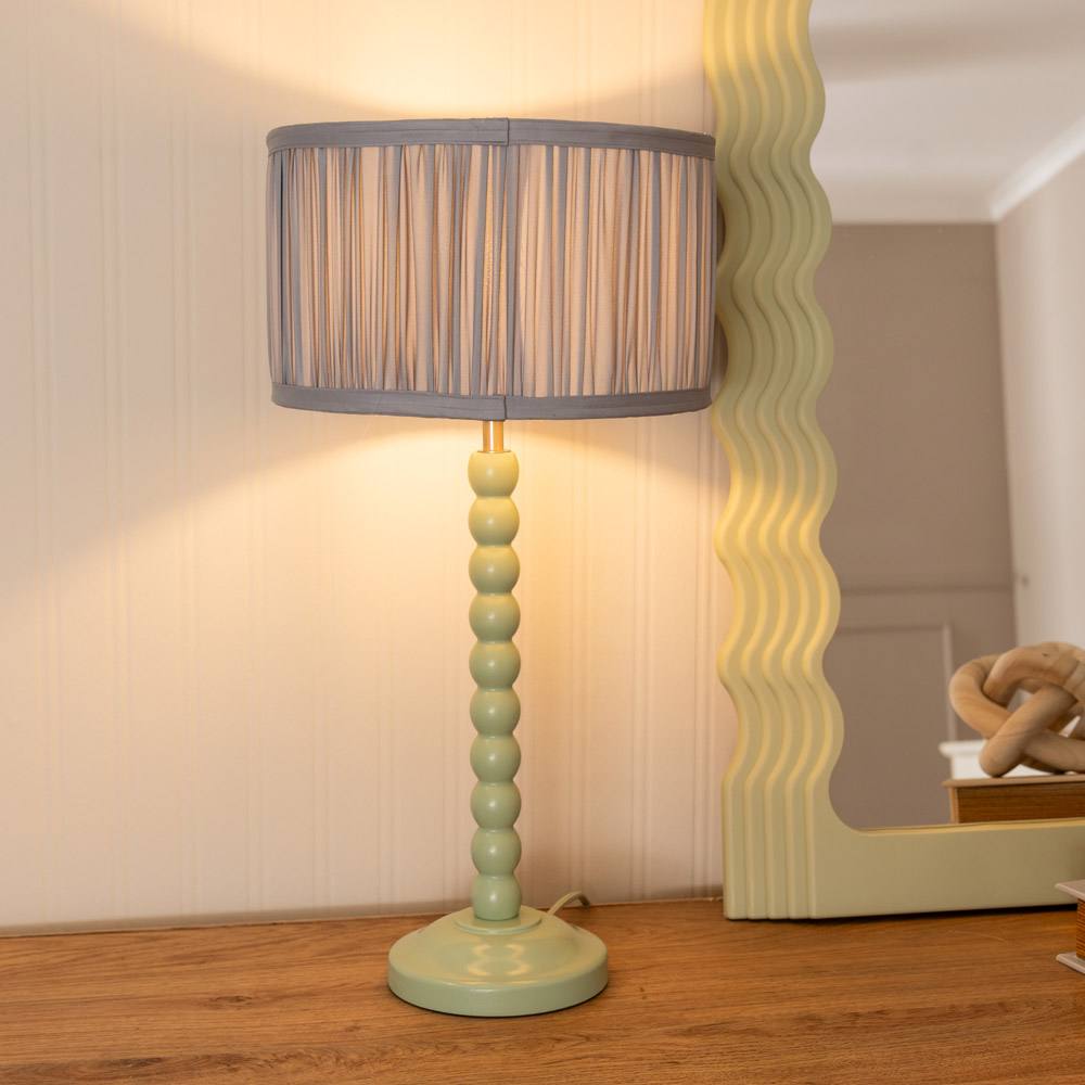 ValueLights Bobbins Sage Green Table Lamp with Ruched Pleated Drum Lamp Shade in Pale Green