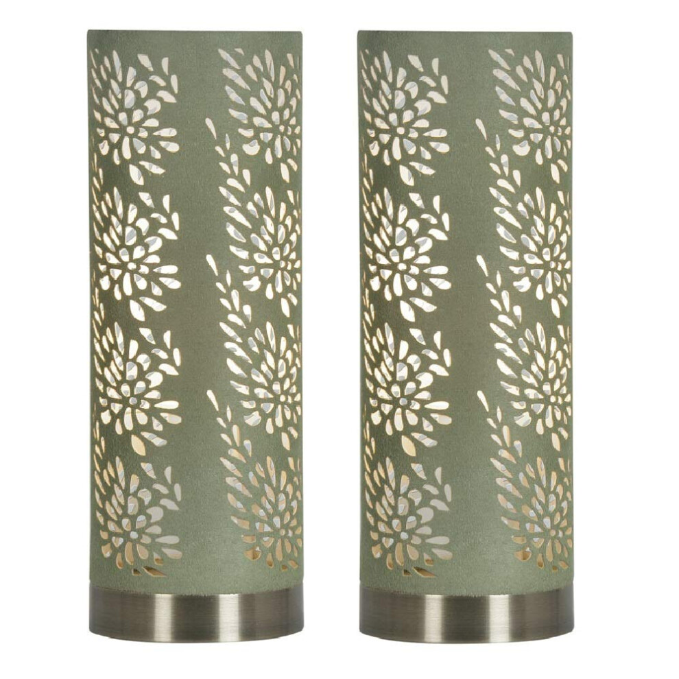 2 Pack - Brushed Brass & Sage Green Suede Floral Etched Cylinder Shade Touch Table Desk Lamp | 1 x E14 SES Dimmable Lamp Bulb Required (Not Included)
