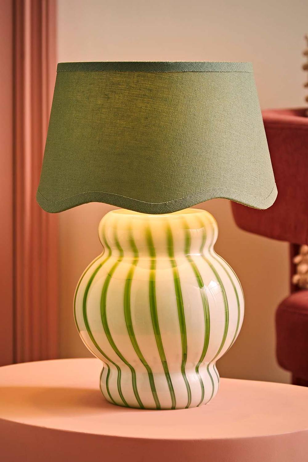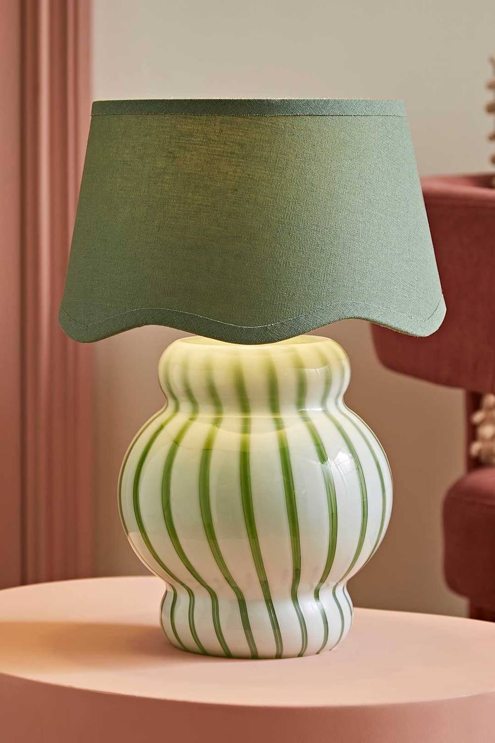 ValueLights Taffy Stripe Green Glass Table Lamp with Sage Scalloped Lamp Shade in Pale Green