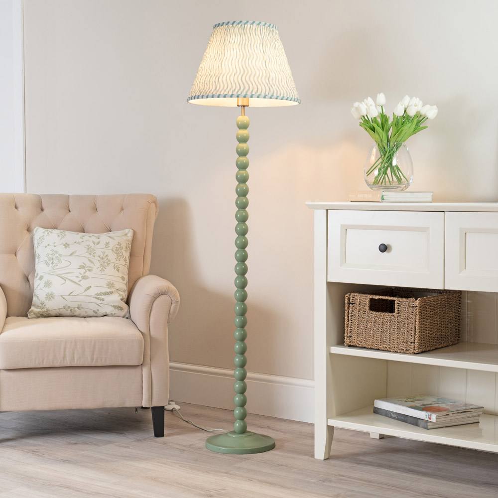 ValueLights Bobbins Sage Green Floor Lamp with Ruched Pleated Drum Lamp Shade in Pale Green