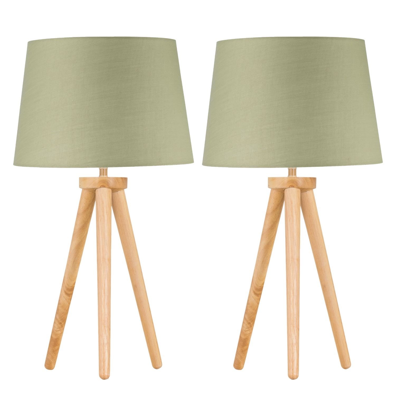 Set of 2 Modern Light Oak Table Lamp Bedside Lights Wood Tripod Sage Green Shade