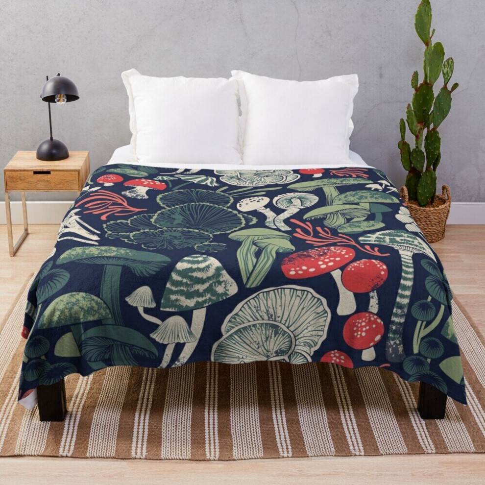 Fleece Throw Blanket Mystical fungi midnight blue sage and forest green red and coral wild mushrooms for Sofa Couch Kids 60 x 50 Inches