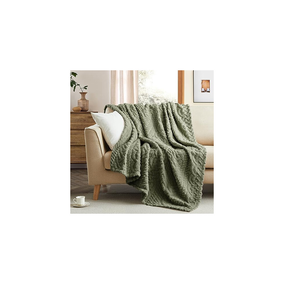Sherpa Throw Blanket,Cable Pattern Decorative Soft Cozy Blanket for Couch Sofa,Light Weight Fleece Warm Throw Blanket for Bed,Olive Sage Green,127 x