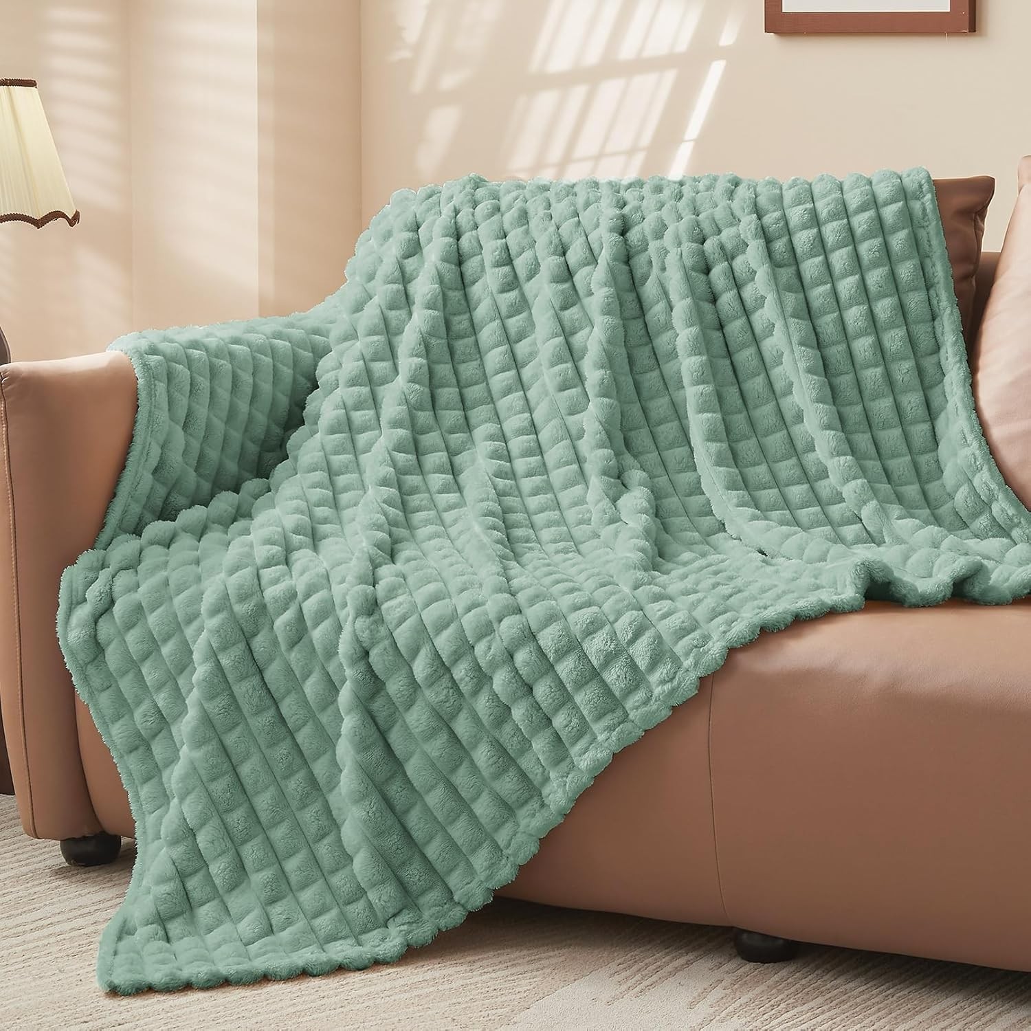 Wajade Fleece Throw Blanket, Fluffy Faux Fur Blanket for Bed Sofa Couch, Soft Warm Thick Blanket,waffle Sage Green-127X178
