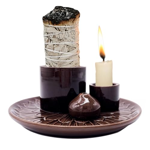 4 in 1 Multifunctional Ceramic Incense and Candle Holder with Ash Catcher Tray Suit for Burning White Sage, Palo Santo Sticks (Dark)