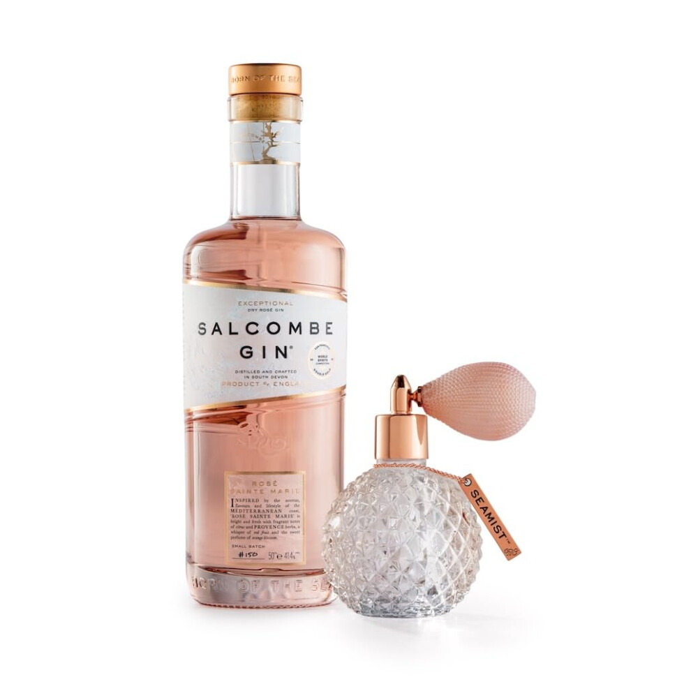 Salcombe Gin Pink Gin Gift Set | 'Seamist and Ros? Sainte Marie' Liquid Garnish in White Gift Box | 50cl + 10cl Glass Spray Bottle and Copper Tag |