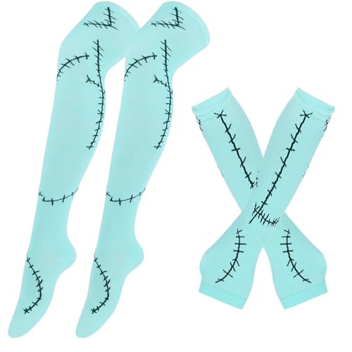 OIUUBBII Halloween Sally Costume Women Arm Sleeves & Thigh Highs - Light Blue Stitched Scar Sleeves for Cosplay, Christmas Party, Festive Leggings & Accessories