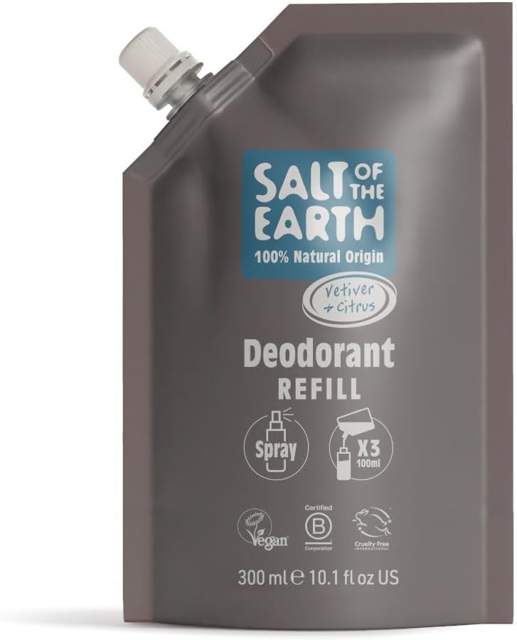 Salt of the Earth - Natural Deodorant Spray Refill Pouch, x3 Uses - Vetiver & Citrus - Vegan, Long Lasting Protection, Leaping Bunny Approved, Made in