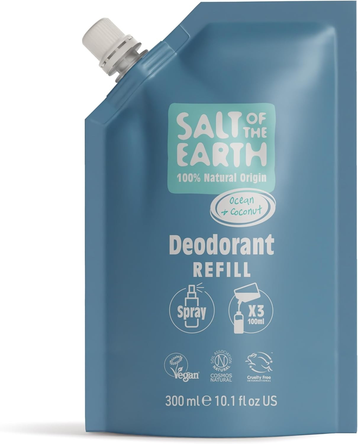 Salt of the Earth - Natural Deodorant Spray Refill Pouch, x3 Uses - Ocean & Coconut - Vegan, Long Lasting Protection, Leaping Bunny Approved, Made in the UK - 300ml