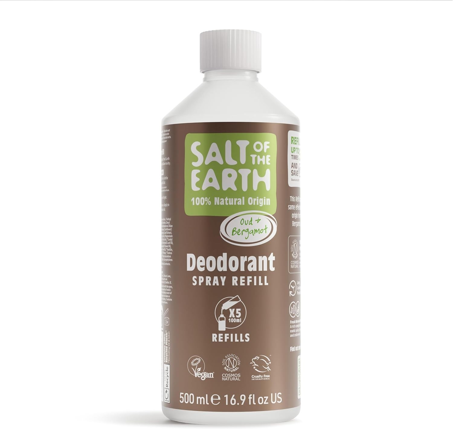 Salt of the Earth - Natural Deodorant Spray Refill Pouch, x3 Uses - Oud & Bergamot - Vegan, Long Lasting Protection, Leaping Bunny Approved, Made in