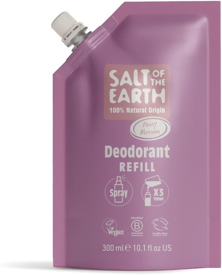 Salt of the Earth - Natural Deodorant Spray Refill Pouch, x3 Uses - Peony Blossom - Vegan, Long Lasting Protection, Leaping Bunny Approved, Made in the UK - 300ml