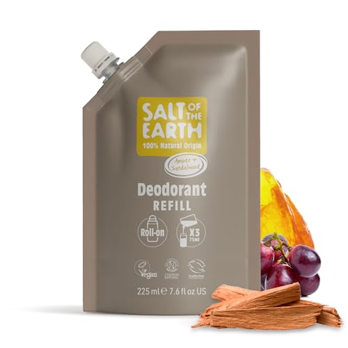 Salt of the Earth - Natural Deodorant Roll On Refill Pouch, x3 Uses - Amber & Sandalwood - Vegan, Long Lasting Protection, Leaping Bunny Approved, Made in the UK - 225ml