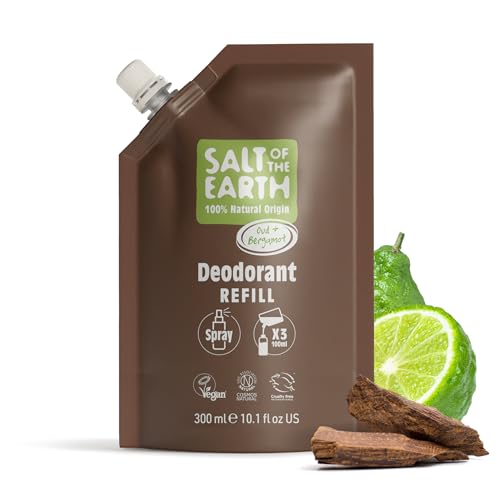 Salt of the Earth - Natural Deodorant Spray Refill Pouch, x3 Uses - Oud & Bergamot - Vegan, Long Lasting Protection, Leaping Bunny Approved, Made in the UK - 300ml