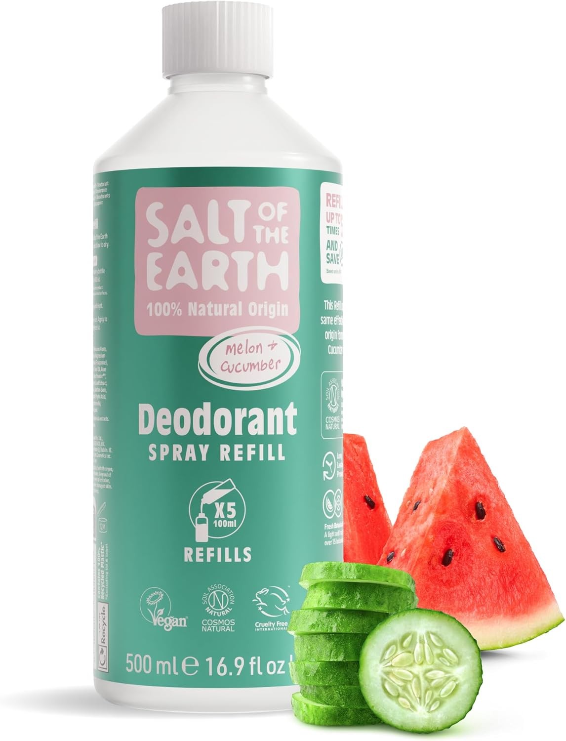 Salt of the Earth - Natural Deodorant Spray Refill Pouch, x3 Uses - Melon & Cucumber - Vegan, Long Lasting Protection, Leaping Bunny Approved, Made in
