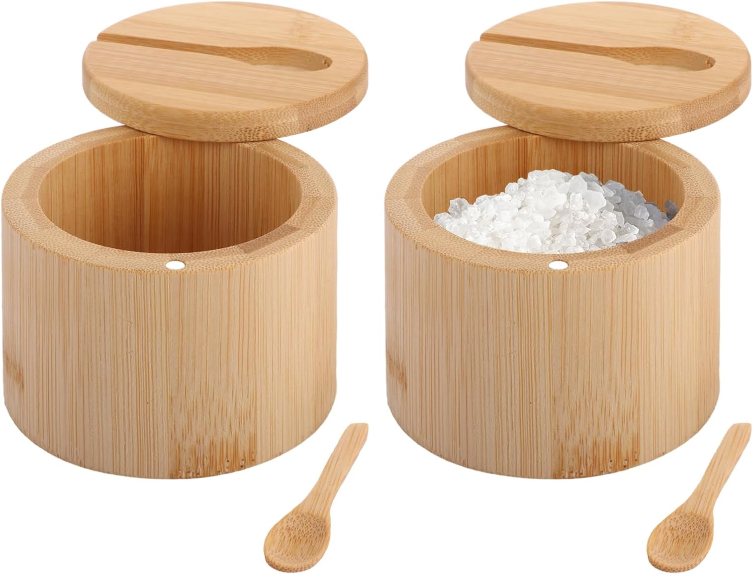 2PCS Bamboo Salt Box,Wood Salt Cellar Bowl Box with Serving Spoon,Salt Pig,Elega