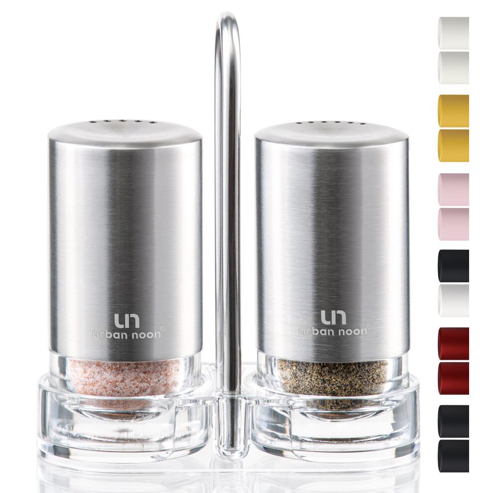 Salt and Pepper Shakers with Holder - Elegant Stainless Steel Salt Shaker and Pepper Shaker Set with Acrylic Holder for Kitchen Counter or Restaurant