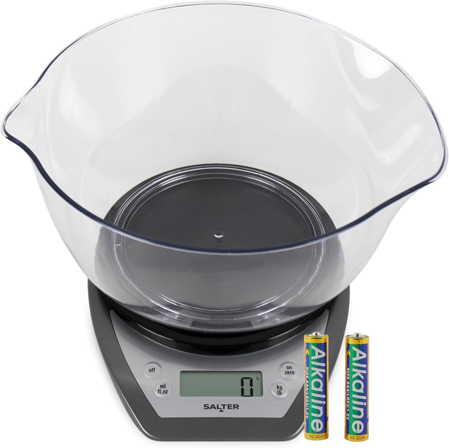 Salter Digital Kitchen Scale With Bowl- 2L Dishwasher Safe Mixing Bowl, Easy Dual Pour Wide & Narrow Spouts, Measure Liquids, Add & Weigh Function, Easy Read Display, 5kg Capacity, Silver