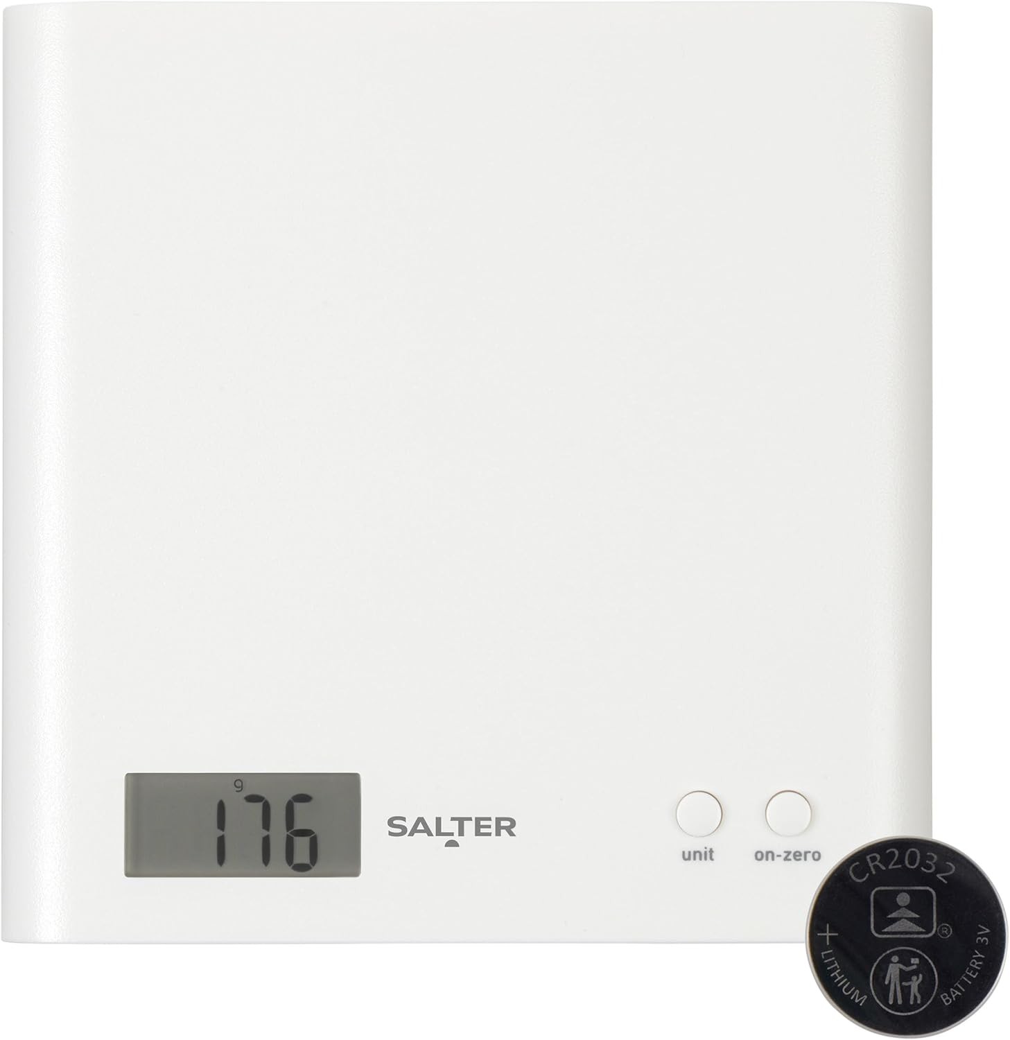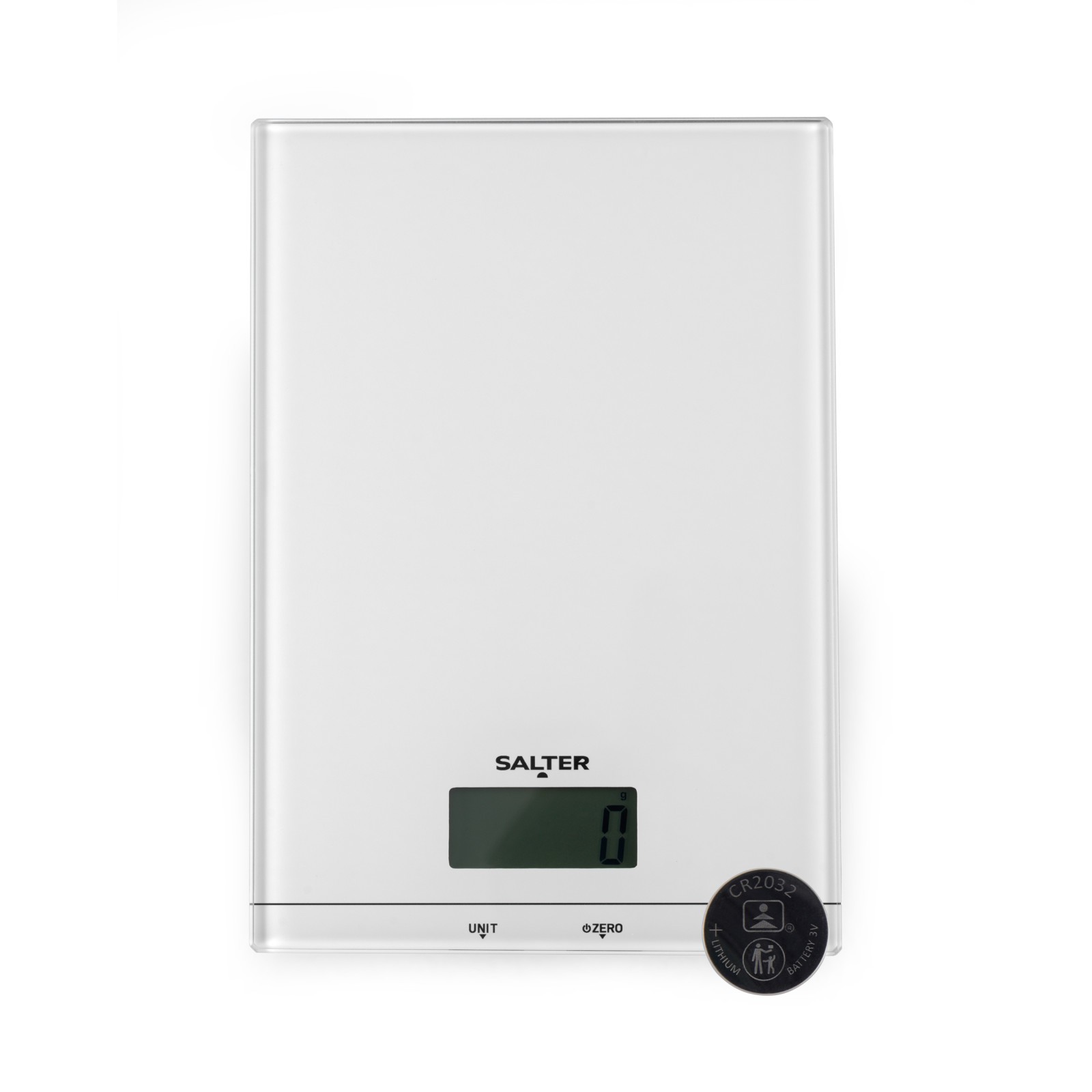 Salter Digital Kitchen Scale - 3kg Capacity, Battery Included, High Precision, Accurate Food Weighing, Easy Read Display, Add & Weigh, Zero Function, Slim Design, Wipe Clean, White, 15 Year Guarantee