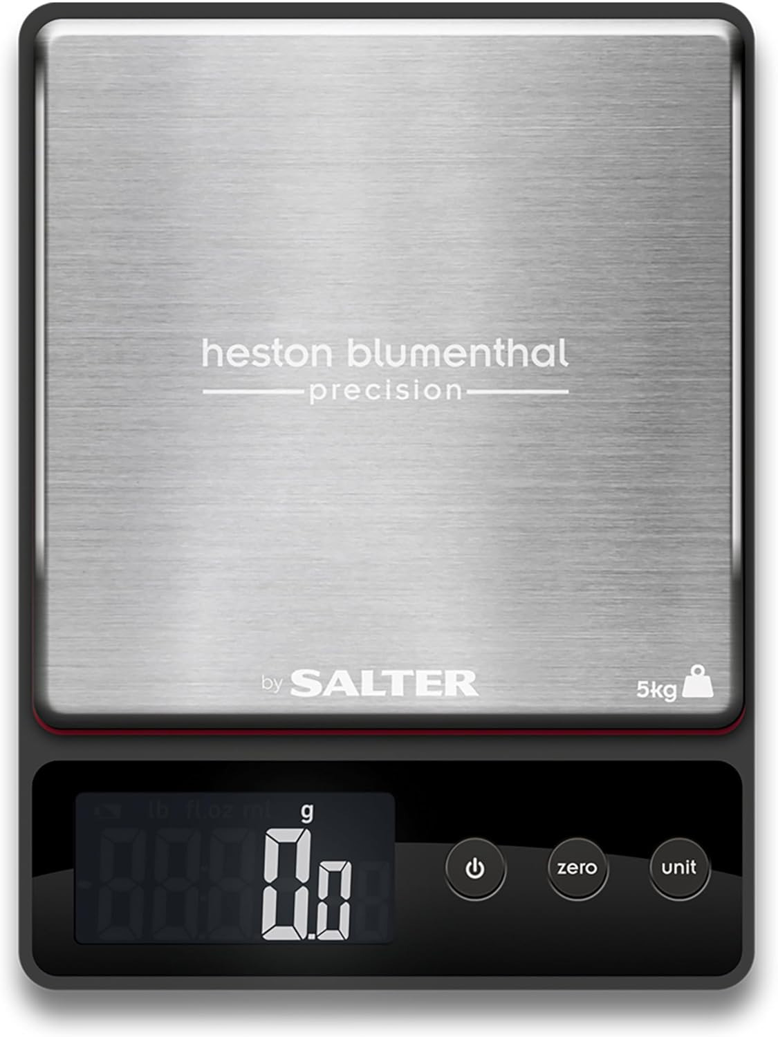 Heston Blumenthal Precision by Salter Digital Kitchen Scales - Premium Compact Baking/Cooking Scale, For Weighing Food/Coffee and Liquid, 0.5 g Increments, Slim, Stainless Steel/Black