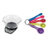 Salter 1024 SVDR14 Dual Pour Electronic Scale with Mixing Bowl, Wide/Narrow Spouts, 2 Litre Bowl, Silver & Colourworks Measuring Spoon Set, 5 Spoons for Measuring Food, Durable, Bright Colours