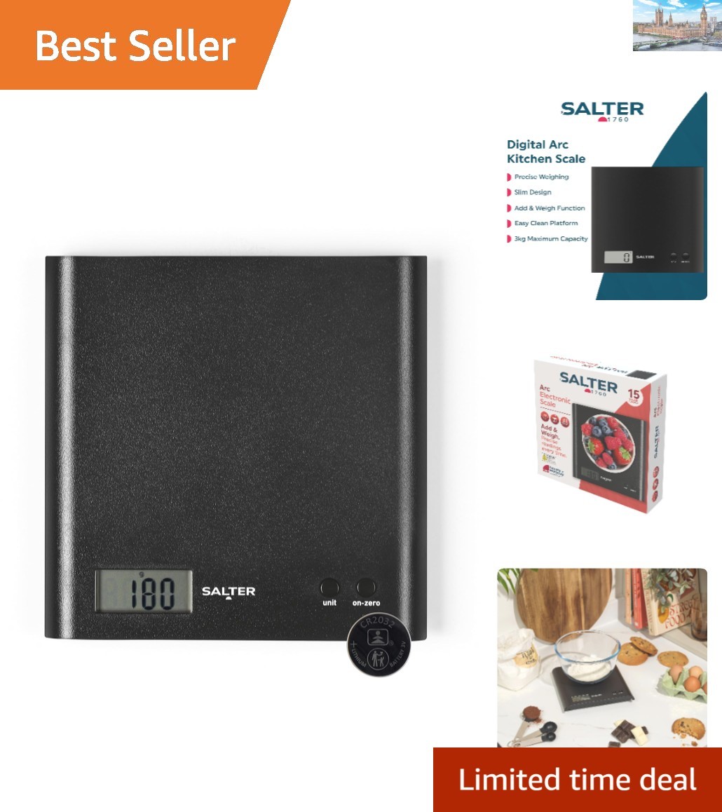 Salter Arc Kitchen Scale Digital Food Weighing Scales Precise Cooking Slim Platform Compact Storage Add Weigh/Tare Function 3kg Capacity Battery Black