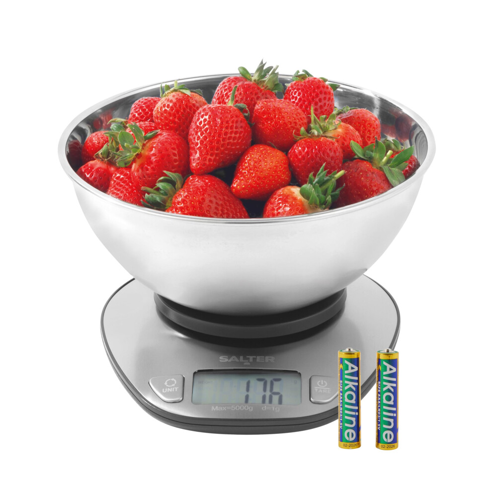 Salter Digital Bowl Scale ? Electronic Food Weighing Scales, 5kg/11lbs Capacity, Stainless Steel Dishwasher Safe 2-Litre Measuring Dish, Tare