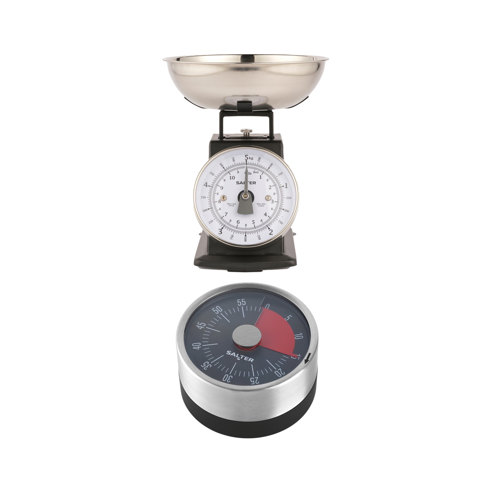 Salter Timeless Mechanical Kitchen Scale & Timer, 5kg Capacity, Black/Stainless
