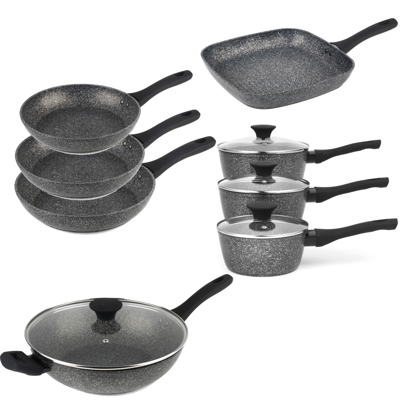 Salter Marblestone 8-Piece Pan Set – Non-Stick Pots & Pans Set, Induction Cookware Set, 16/18/20cm Saucepans, 20/24/28cm Frying Pans, Wok, Griddle Kitchen Pan, Healthier Frying & Cooking Set, Grey