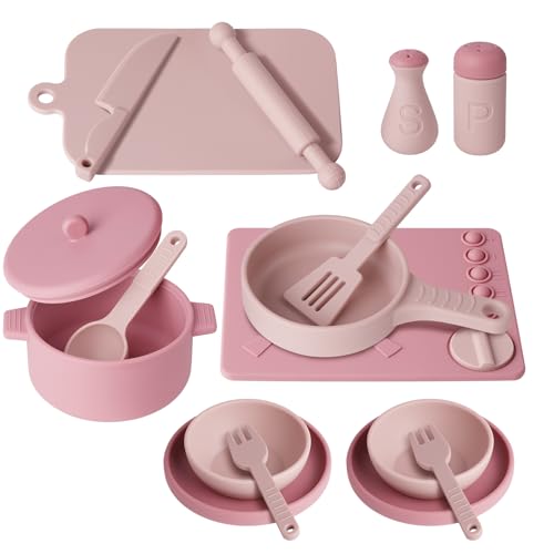 HOTUT Silicone Pretend Play Kitchen Accessories Set, 16pcs Cooking Cookware Pots and Pans Playset, Kids Kitchen Set, Educational Gift Toy for Kids Age 3-8