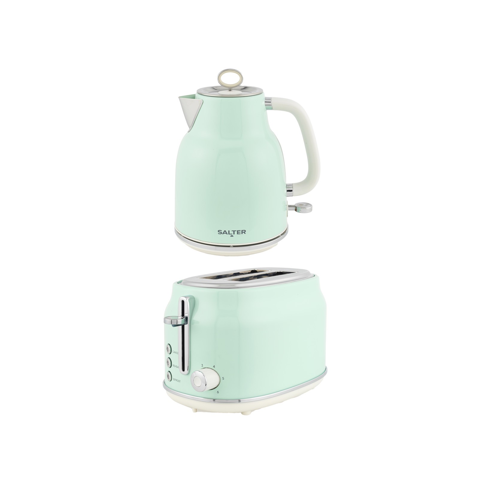 Salter Retro Kettle & 2-Slice Toaster Set - Wide Slots, 3KW Rapid Boil, 6 Browning Levels, 360° Base, Removable Limescale Filter, Defrost, Reheat & Cancel, High-Lift Eject, Removable Crumb Tray, Green
