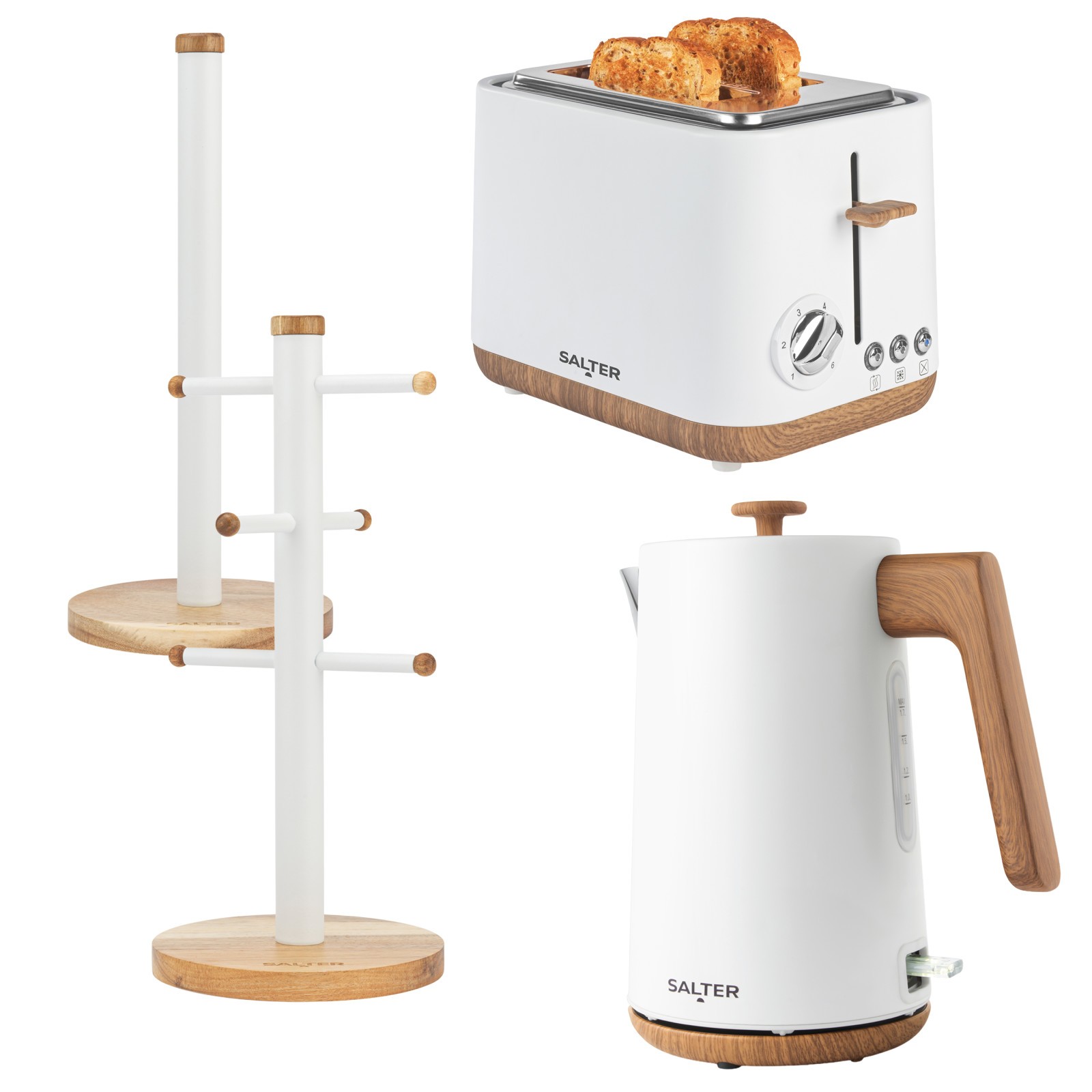 Salter Toronto Set–Kettle, 2-Slice Toaster, Mug Tree & Kitchen Roll Holder White